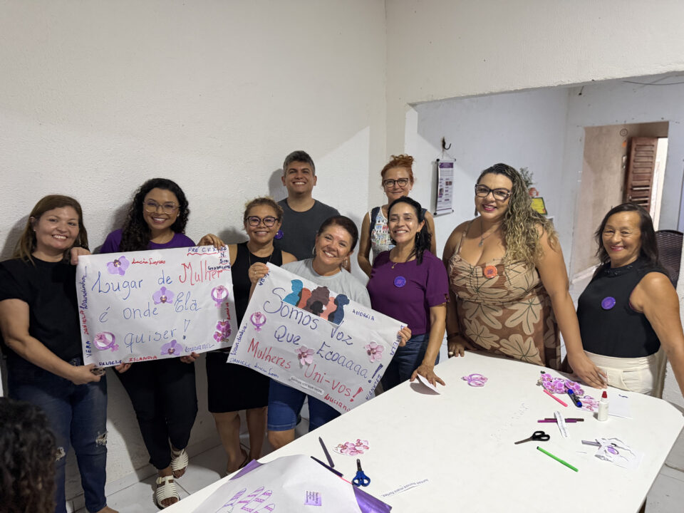 Dando continuidade à programação, foi realizada uma atividade de confecção de cartazes inspirados no tema da campanha e nos diálogos vivenciados ao longo do encontro. Os materiais produzidos foram afixados na entrada da associação, como expressão do compromisso coletivo assumido e como sinal visível da mobilização em defesa da vida das mulheres. A jovem Renata Rosa, participante do Movimento das Orquídeas, partilhou sobre a importância do espaço de reflexão da perspectiva da violência sofrida pelas mulheres e do trabalho de cuidado que a elas é geralmente atribuído, ressaltando que as mulheres saíram fortalecidas da atividade para seguirem com suas lutas.